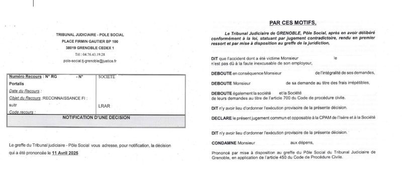 Elle s’apprêtait à plaider un dossier dans le cadre d’une demande de reconnaissance de la faute inexcusable de notre cliente devant le pôle social du Tribunal judiciaire de Grenoble.