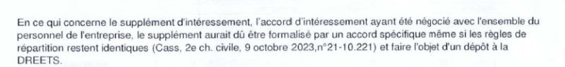 – Le supplément d’intéressement aurait dû faire l’objet d’un accord spécifique et ce même si les règles de répartition sont identiques à l’accord initial.